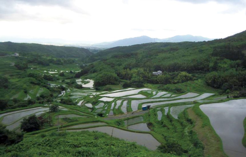 別府市は大分県の東海岸の中央に位置する日本有数の温泉観光都市です。内成棚田は別府温泉からは南東10kmほどの高崎山に続く山並みを越えた標高約130~ 300mの斜面にあります。集落は9つで構成され人口は約190名です。棚田は石積みが中心で平安末期から開墾が始められたといわれ江戸時代初期には現在に近い形が出来上ったと伝えられています。棚田を潤す石城寺明神様の水源は、標高450mの高所から湧き出でており、大雨後も濁ることのない水といわれ地元の人々は年2回のお祭りでその恩恵に感謝していいます。面積42㏊、枚数は1000枚以上と棚田百選の中でも5番目の面積であり、しかも棚田全体が一望できる範囲に収まっているという点からいえば日本でも1~2を争う規模といえるでしょう。これらの棚田の保全は主に二つの団体「内成活性化協議会」、「内成の棚田とむらづくりを考える会」が担っています。