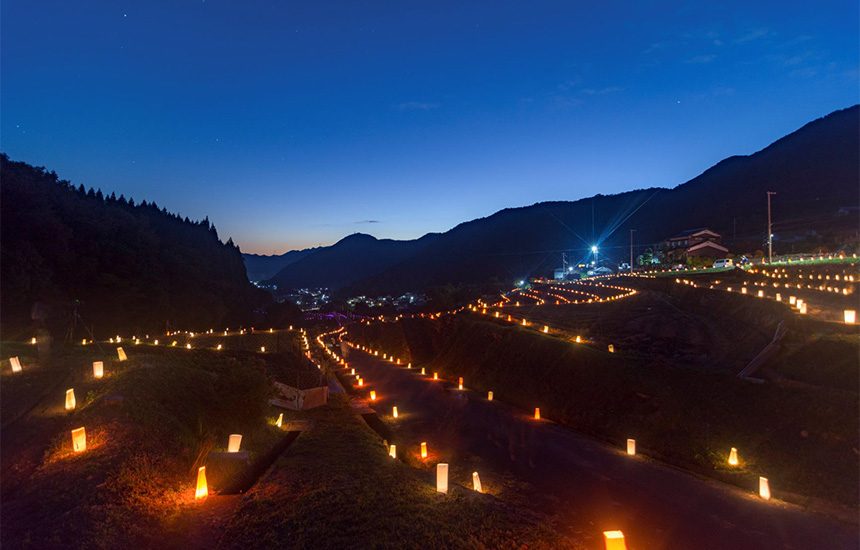 棚田の石垣に沿って、数千個のろうそく灯篭やPETボタルを点灯する「棚田のあかり」イベントは見事で多くの観光客に人気。実施時期は10月上旬~12月上旬。