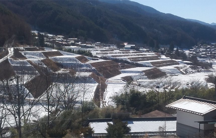 伊那市高遠町三義地区の山間を流れる山室川に沿って棚田が拡がっています。急峻な所では1/5、川沿いの開けた部分では1/20程の勾配の棚田です。山室地区は高齢化、担い手の減少などで耕作放棄が進む地域でしたが、直接支払制度の活用や地元有志による農事組合法人山室の設立により活気を取り戻してきました。ここの棚田の特徴は酒米の栽培が盛んなことです。「ひとごこち」「美山錦」「山恵錦」などの酒米が生産され、酒造会社と提携した高遠の地酒「やまむろ」は高遠町の人気商品となっています。棚田オーナー制度は農村と都市住民との交流の場を提供すると共に、田舎らしい風景の存続、地元住民の協働事業となっています