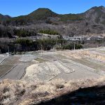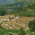 大分県玖珠町は県の中央部に位置し、その西端に山浦杉河内があります。日本の棚田百選の山浦早水に隣接する集落でもあります。久大本線の杉河内駅前より徒歩にて県道704号の坂道を15分程のぼると集落に着く。県道の坂は、玖珠川左岸に発達する河岸段丘の段丘崖であり玖珠川の支流山浦川が段丘崖を駆け下り慈恩の滝になっています。段丘上には山浦川の狭い谷底平野が形成され川の両岸に杉河内の集落が展開され、右岸の22戸が玖珠町に属しています。集落周辺の棚田は集落のなかを通る道路によって上下段に二分されています。