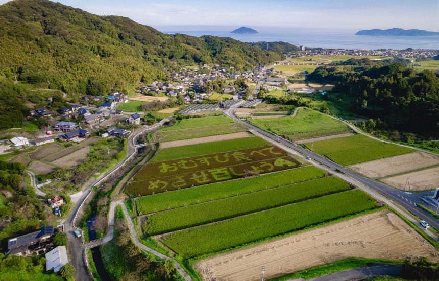 福岡県西部の糸島半島、糸島市の南西部に吉井上棚田はあります。吉井上集落の農地は急傾斜の山間部と海岸線に近い緩傾斜から形成されている為、棚田での水稲生産と海沿いの日当たりが良い山間部の地形を生かした柑橘の生産が盛んに行われてきました。しかし、農業者の高齢化が進むにつれて遊休農地化が危惧されるようになったことから、農業者が中心となり平成12年に吉井上農地を守る会が結成され農道や水路などの改良と管理を地域で協力して行いっています。夏にはホタルが飛び交い、秋には「赤米の花見会」「神幸祭」が行われる他、「棚田の田んぼアート」「棚田のこいのぼり」など多くの写真愛好家に知られています。現在、「みんなで兼業農家になろうプロジェクト」を立ち上げ、棚田オーナー制度を一歩進めた形で田と機械などを貸し出し、自家用のお米を一から作る楽しみを味わっていただく取り組みを行っています。
