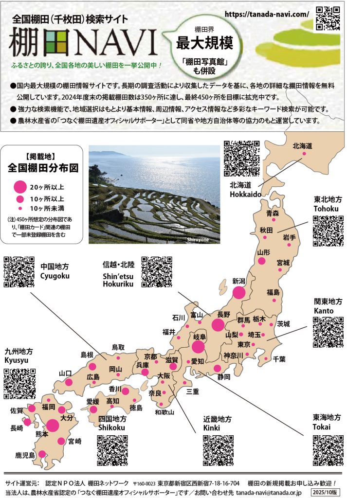 このサイトは、2020年4月にオープンした国内最大級の棚田情報サイトです。地域別棚田情報はもちろん、オーナー制度、ライトアップ、棚田カードなどの基本情報のほか周辺観光情報・特産品・宿泊施設など多彩な情報を提供しており、強力な検索機能でそれぞれ任意の項目につき検索できます。GoogleMap連動の棚田アクセス機能も利用できます。当会は農水省の「つなぐ棚田遺産オフィシャルスポンサー」として同省や地方自治体・保存会との連携のもと運営しており、各地の個性豊かな棚田の魅力を知ってもらい、観光、農体験、研究、保全などのニーズに役立てていただくことを目的に450ヶ所掲載を目標に充実を図って参ります。